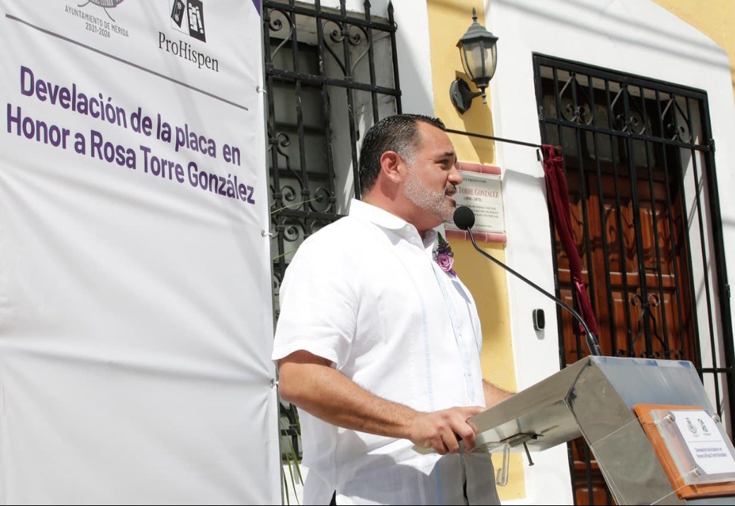 Durante su discurso, efectuado durante la develación de la placa conmemorativa en el predio que habitó Rosa Torre González, en el barrio de Santa Ana, el Primer Edil señaló que esta actividad es una oportunidad para reflexionar la lucha de esta mujer por ocupar un puesto de elección popular, siendo un hecho inédito en esa época que una mujer ocupara el cargo de regidora en el Ayuntamiento de Mérida.