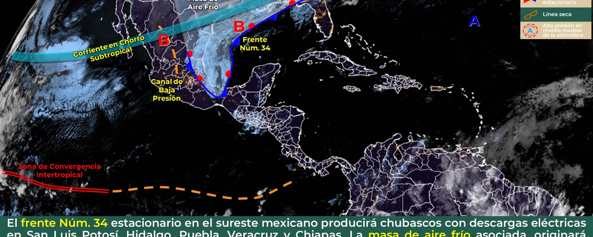 Se prevé que debido al ingreso de aire marítimo tropical, en combinación con el fuerte calentamiento diurno y el establecimiento de una vaguada sobre el occidente de la región, favorecerán condiciones de cielo medio nublado con probabilidad para intervalos de chubascos sobre el centro, norte y noroeste de Yucatán, así como chubascos con tormentas sobre la porción central y sur de Campeche, mientras que para la región costera de Quintana Roo se esperan