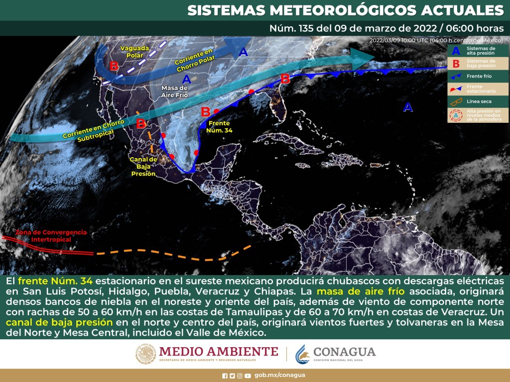 lloviznas aisladas. El ambiente será caluroso a muy caluroso durante el día y cálido en la noche. Viento dominante de dirección sureste, cambiando por la tarde al noreste de 20 a 30 km/h y rachas mayores a 45 km/h en zonas costeras.