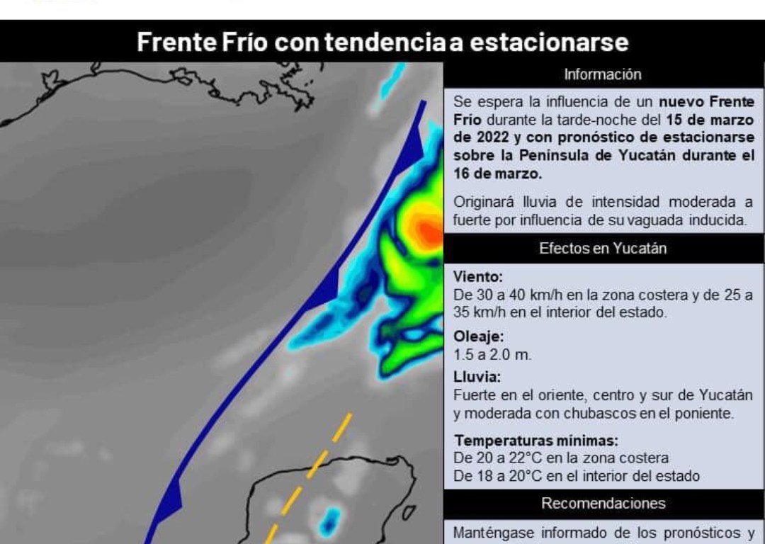 Mérida, Yucatán, 13 de marzo de 2022.- Un nuevo frente frío influirá, durante la tarde y noche de este martes 15, hasta el miércoles 16, y refrescará con registros en los termómetros similares a los de este fin de semana, mínimos de 18 a 20 grados Celsius, en el interior de la entidad, y de entre 20 y 22, en la zona costera, informó la Coordinación Estatal de Protección Civil (Procivy).