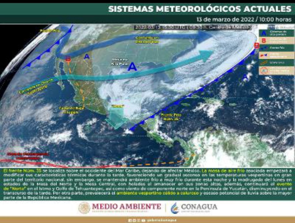 Debido al paso del frente frío No. 35 y su masa de aire frío cubriendo la península de Yucatán, favorecerá nublados con chubascos en zonas del noreste y oriente de Yucatán, sur de Campeche, así como en el norte, centro y sur de Quintana Roo. Viento soplando del norte-noreste de 20 a 30 km/h con rachas de 50 km/h en zonas costeras. Las temperaturas máximas disminuyendo, siendo cálidas y frescas a