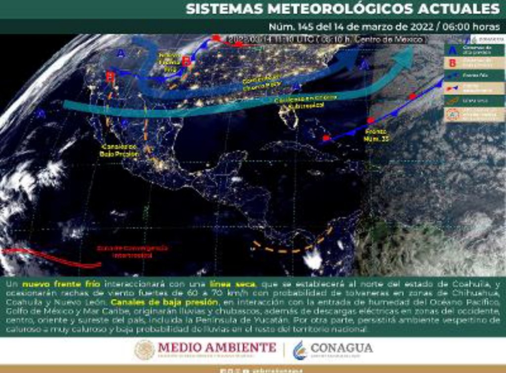 La masa de aire frío que acompaña al frente frío No. 35 continuará modificando sus características térmicas sobre la península de Yucatán, generando condiciones de cielo parcialmente nublado en gran parte de la región, así como probabilidad para lloviznas dispersas en el norte y sur de Quintana Roo, noreste de Yucatán, sur y centro de Campeche. Ambiente caluroso en el día y templado durante la noche. Viento del este-noreste de 15 a 25 km/h y rachas mayores a 40 km/h en zonas costeras de Yucatán y Campeche.