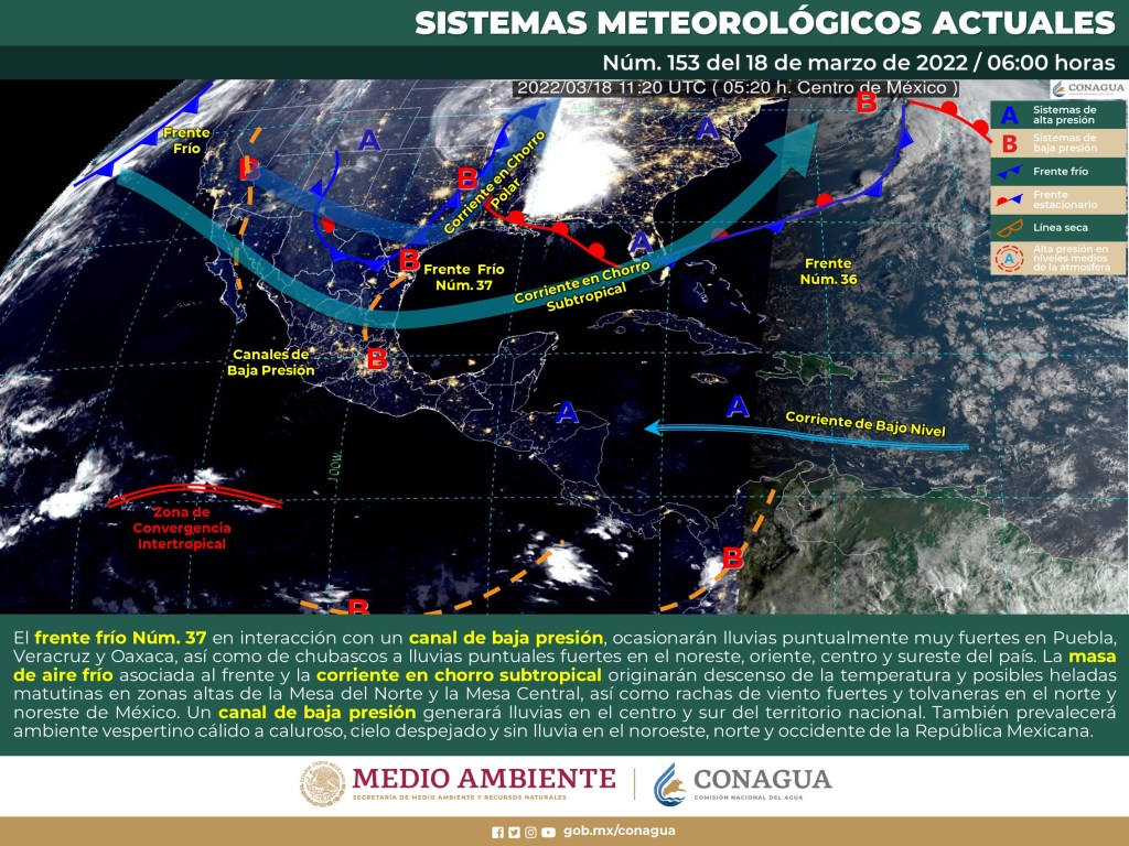 como el centro y sur de Quintana Roo, se prevén lloviznas aisladas. El ambiente será caluroso a muy caluroso en el día y cálido al amanecer, con vientos del sureste de 15 a 25 km/h, cambiando al noreste con rachas de hasta 45 km/h.
