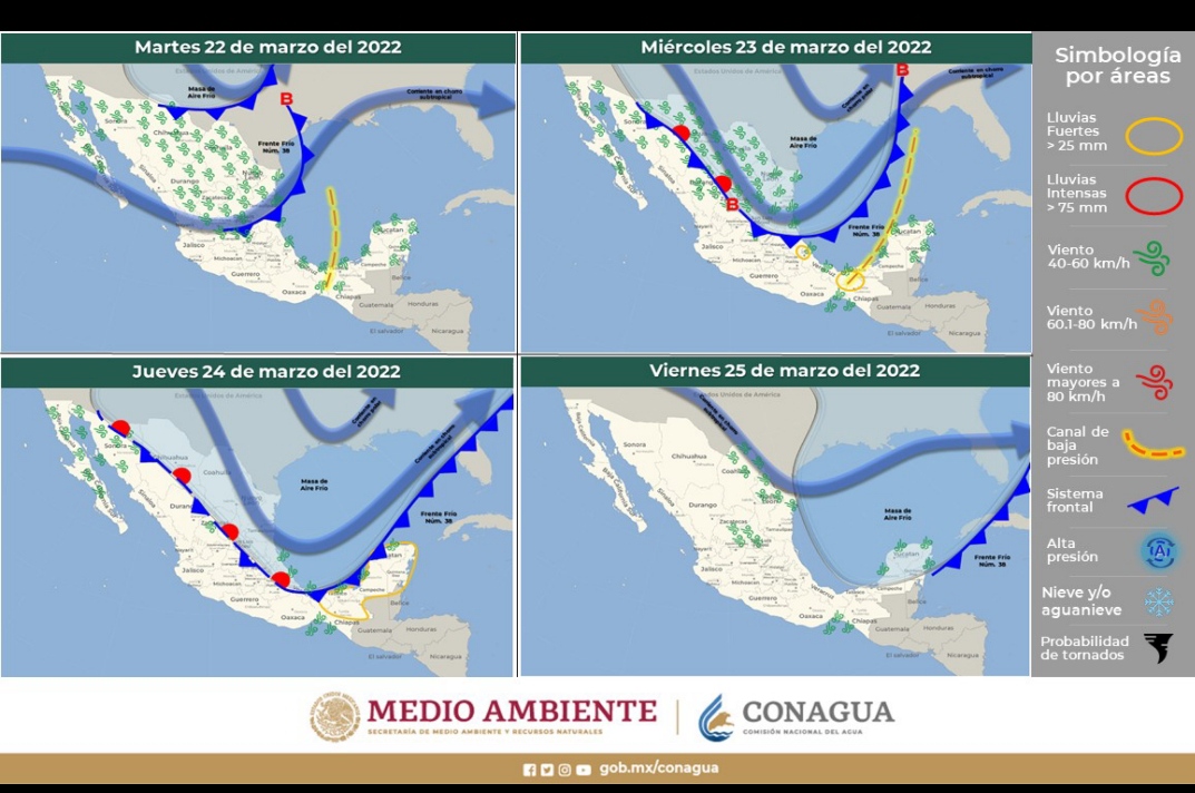 Jueves 24. El ingreso del frente frío No. 38 a la península de Yucatán, ocasionará potencial para lluvias muy fuertes a intensas en el norte, centro y sur de Campeche, noroeste, centro y oriente de Yucatán, así como lluvias fuertes a muy fuertes en el norte, centro y sur de Quintana Roo. Asimismo, se pronostica