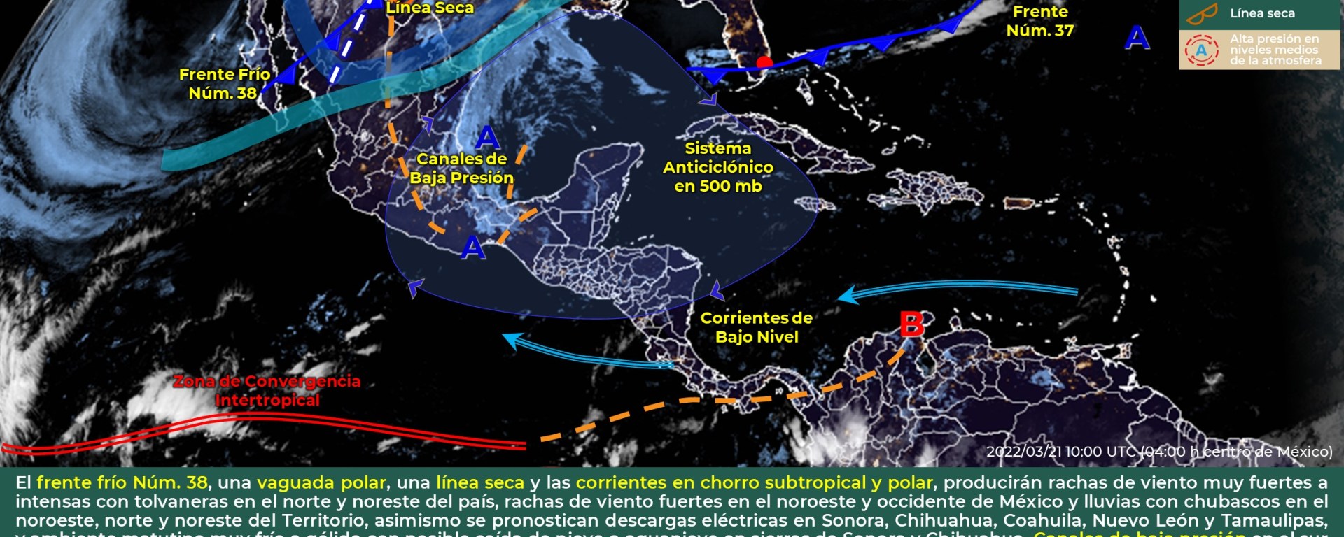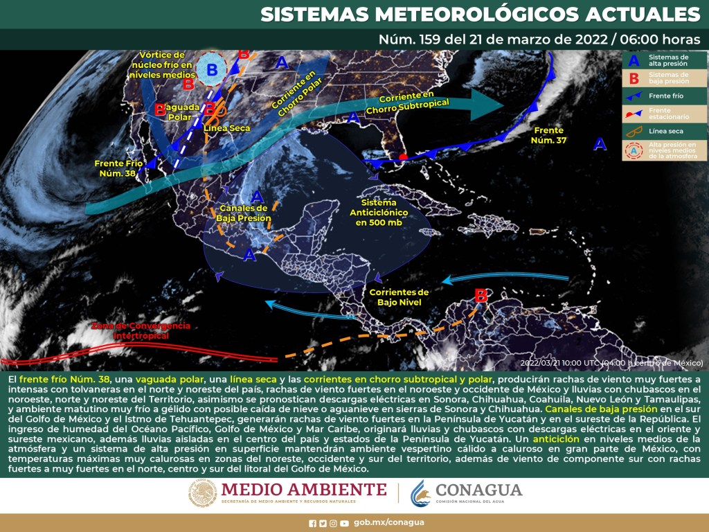 península de Yucatán, favorecerá condiciones de cielo despejado en la mayor parte de la región, así como nublados dispersos con probabilidad para lluvias aisladas en el norte y sur de Quintana Roo, oriente de Yucatán, centro y sur de Campeche. Viento dominante de dirección sureste de 15 a 25 km/h y rachas mayores a 40 km/h en zonas costeras. Ambiente muy caluroso en la tarde y cálido durante la noche.