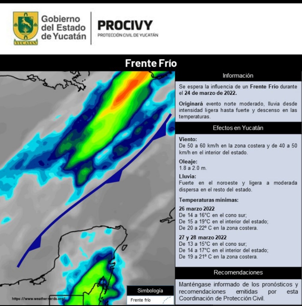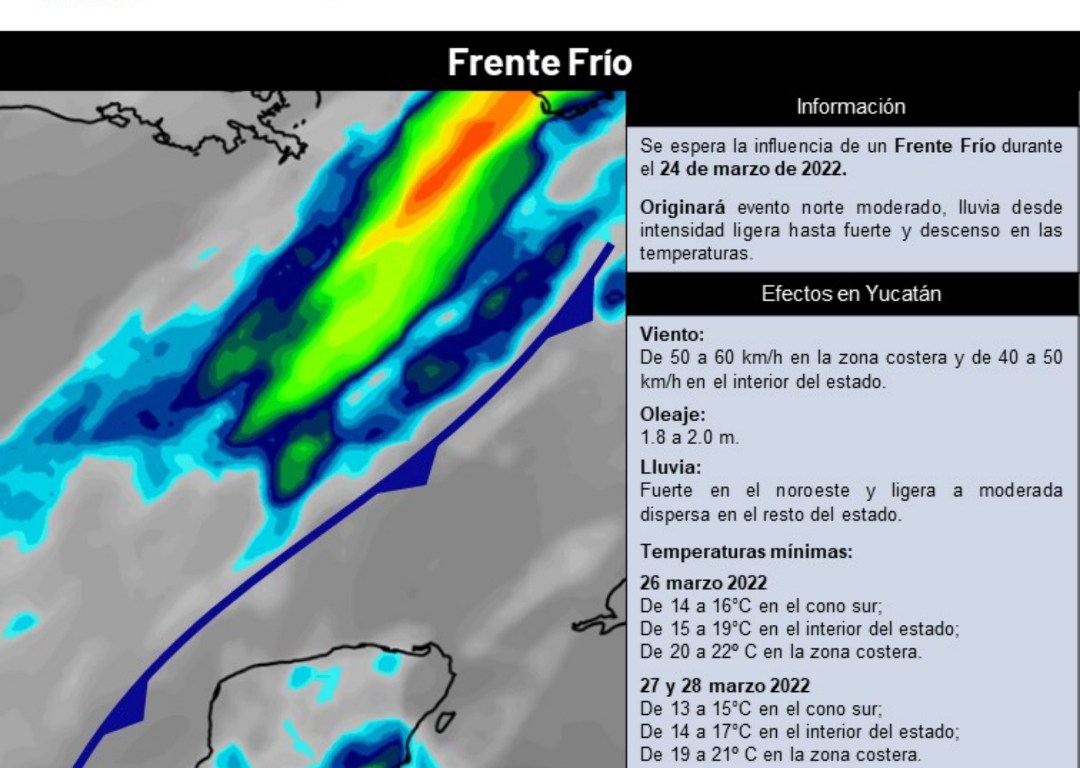 Mérida, Yucatán, 23 de marzo de 2022.- Otro frente frío llegaría este jueves 24 y, al menos en los siguientes cuatro días, causaría descensos de temperaturas, de manera que prevalecerá un ambiente fresco en la mayor parte del territorio, informó la Coordinación Estatal de Protección Civil (Procivy).