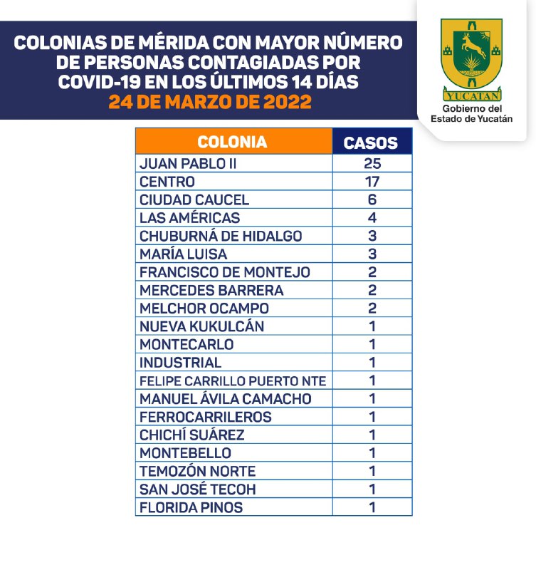 LAS COLONIAS DE MÉRIDA CON MAYOR NÚMERO DE PERSONAS CONTAGIADAS EN LOS ÚLTIMOS 14 DÍAS SON: