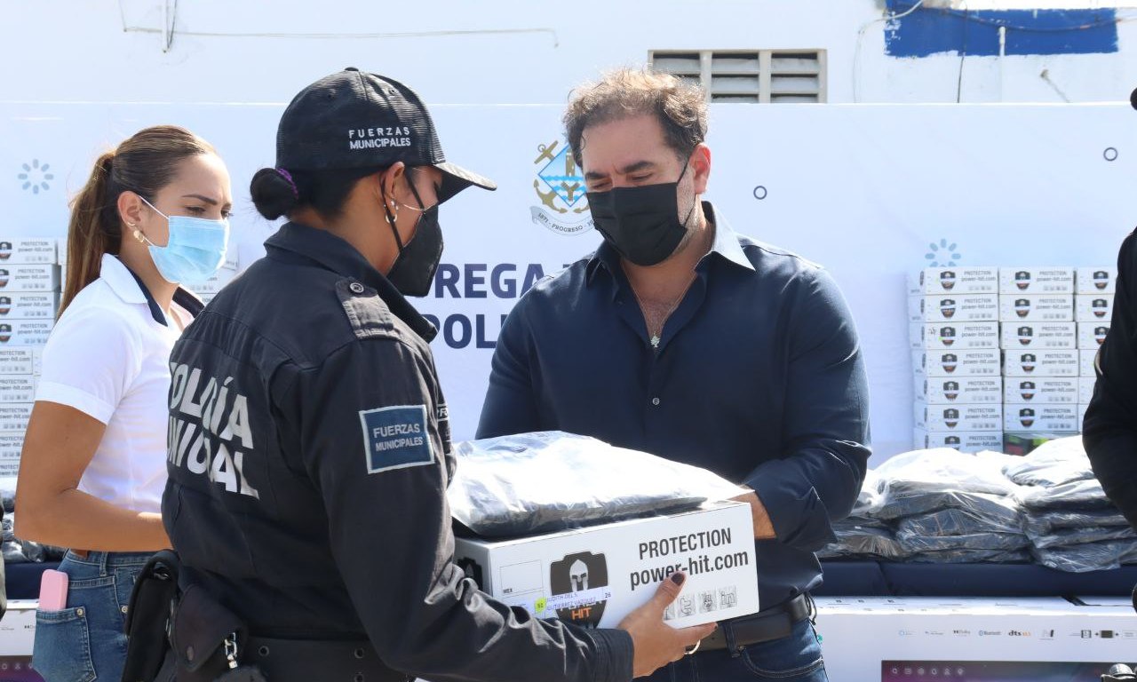 Asimismo se realizó la entrega simbólica a los elementos, Jesús Iván Cruz Landa y Judith Gutiérrez Vázquez de 145 uniformes completos con cinturones, botas, pantalones, camisas, 14 llantas para las unidades vehiculares, 6 computadoras, 2 pantallas y 24 pantallas para monitoreo de videograbación, para fortalecer la actuación de las corporaciones policiacas municipales.