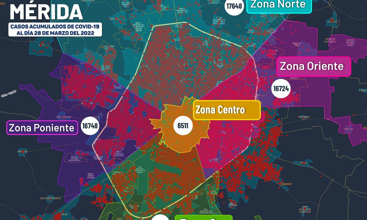 Específicamente, en Mérida se han diagnosticado 68,565 personas contagiadas de Coronavirus (casos acumulados al 29 de marzo), que viven en: