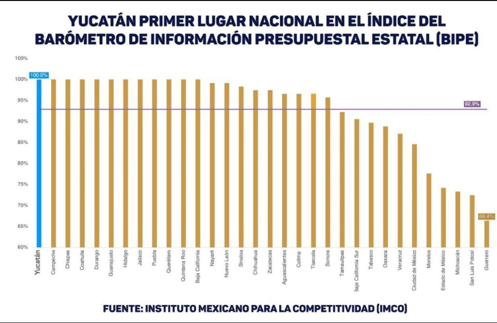 Mérida, Yucatán, 31 de marzo de 2022.- Yucatán obtuvo el primer lugar nacional en el Índice del Barómetro de Información Presupuestal Estatal (BIPE), que publica el Instituto Mexicano para la Competitividad (IMCO), al lograr una puntuación del 100% de cumplimiento de los 116 criterios de la evaluación correspondiente al ejercicio fiscal 2021, lo que significa que en el estado se tiene una administración más transparente y eficiente en la planeación de los recursos públicos, en favor de una mejor la calidad de vida para las familias yucatecas.