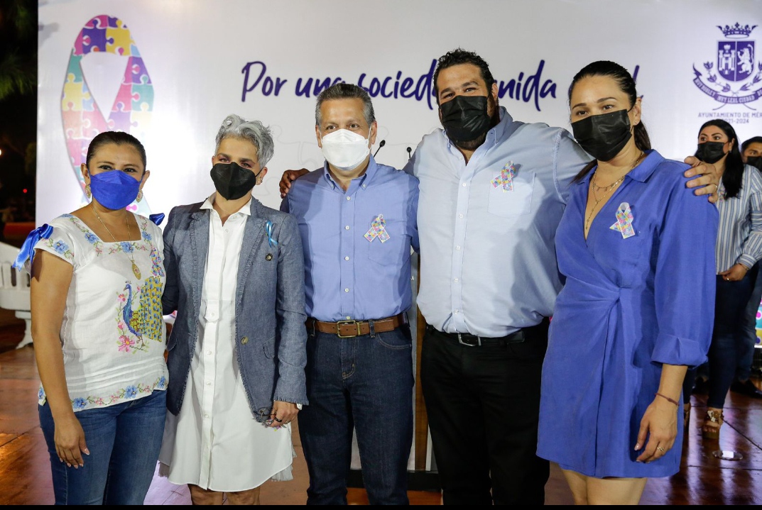 Ante directivos e integrantes de asociaciones civiles relacionadas con el autismo, personas con autismo y sus familias, funcionarios municipales, el secretario municipal, Alejandro Ruz Castro, las diputadas federales Federica Quijano Tapia y Kathia Bolio Pinelo, acompañas de sus hijos, formaron con bloques que semejaban piezas de rompecabezas, la palabra autismo, con la que se completó la frase: Por una sociedad unida en el autismo.