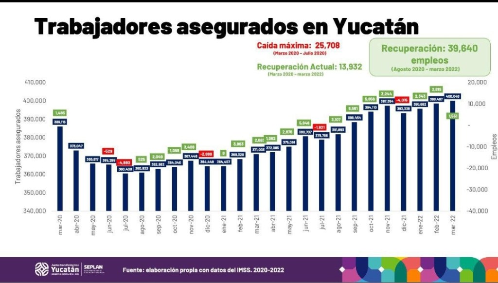 Hay que recordar que, por efecto de la pandemia, en tan sólo cuatro meses se perdieron 25 mil 708 plazas laborales, sin embargo, fruto de la promoción realizada por el Gobernador Vila Dosal para atraer inversiones a Yucatán, así como la enérgica estrategia de reactivación económica, esta cifra ha sido superada.