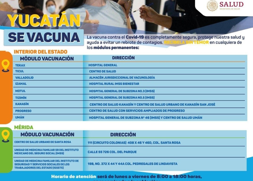 La Secretaría de Salud del estado (SSY), informó que, en Umán, se instalarán dos sedes en el Centro de Salud y en el Instituto Mexicano del Seguro Social (IMSS) de esta localidad; en Kanasín, también serán dos módulos en el Centro de Salud ubicado en el centro de la ciudad y el Centro de Salud Urbano de la colonia “San José”; mientras que, en Progreso, se dispondrá de un módulo en el Centro de Salud del municipio.