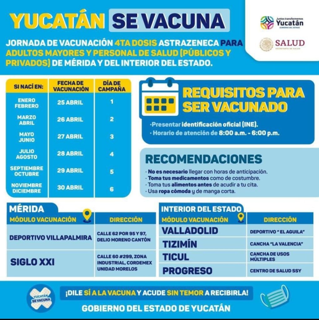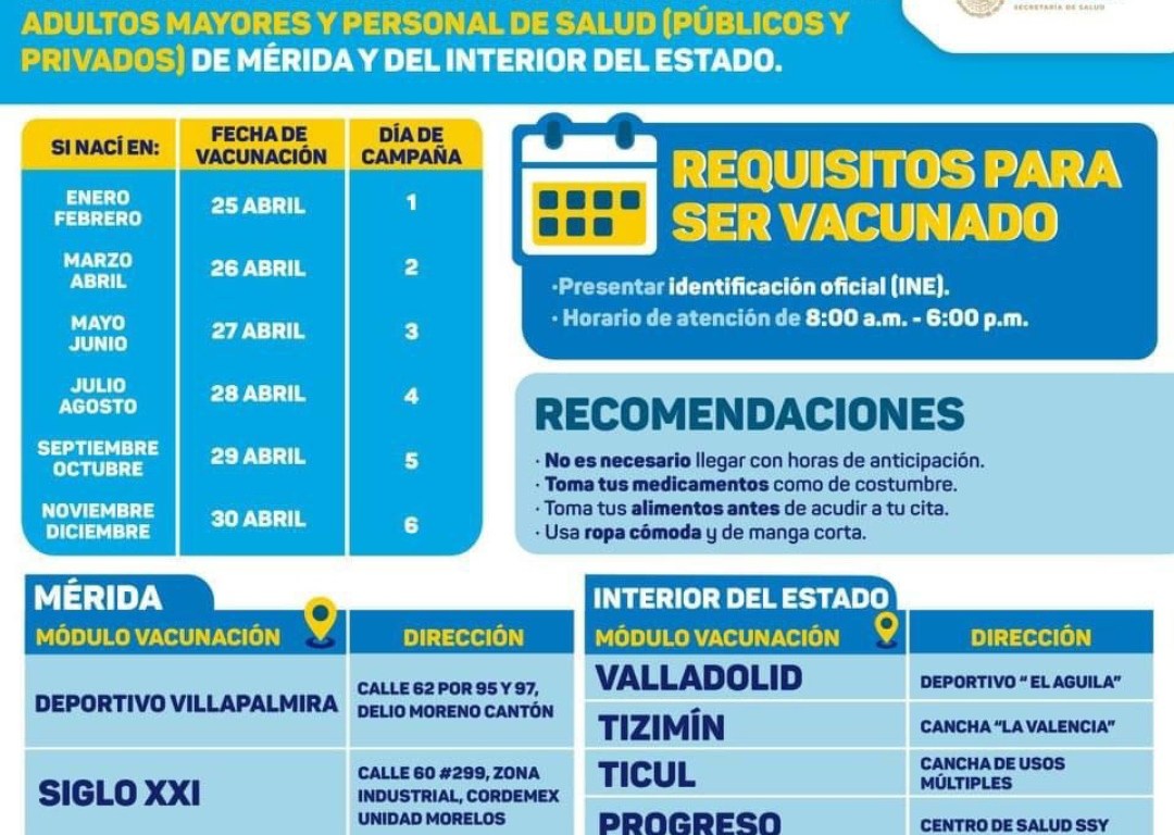 -Esta etapa de vacunación se desarrollará del lunes 25 al sábado 29 de abril en los municipios de Mérida, Valladolid, Tizimín, Ticul y Progreso.