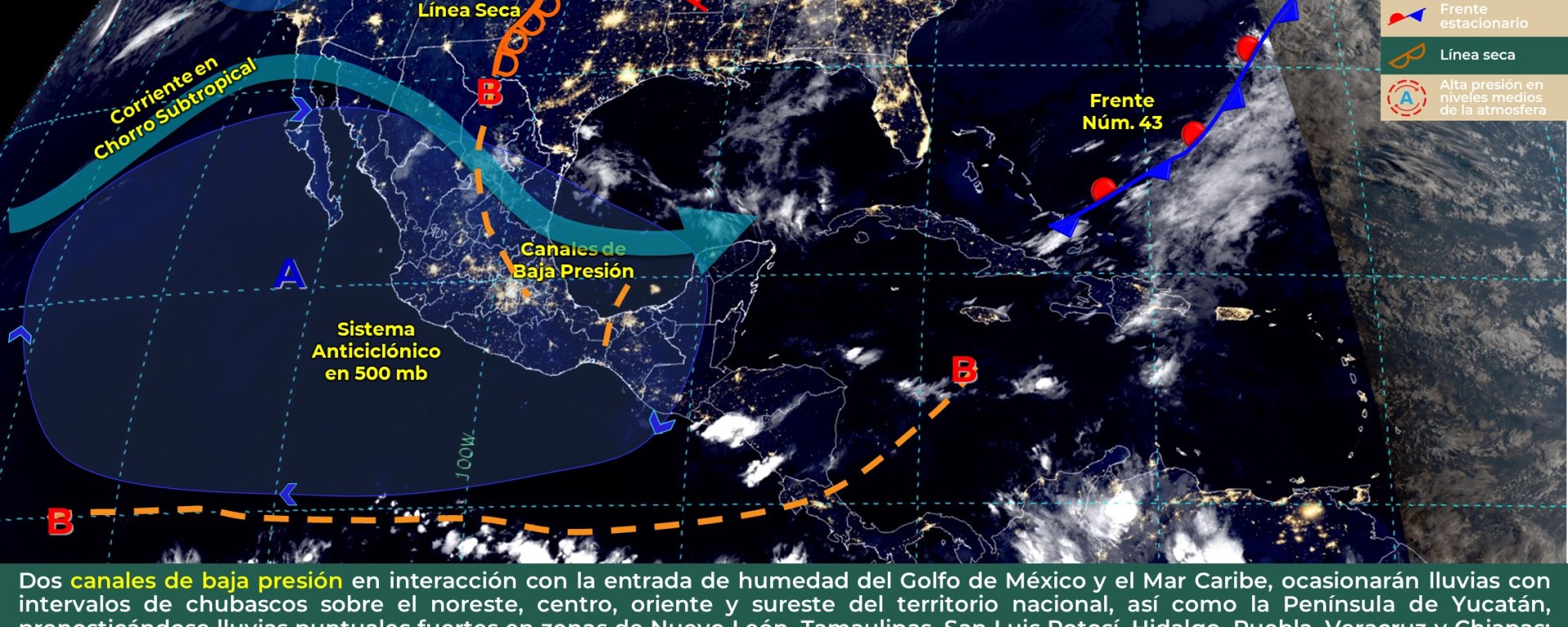 fuerte calentamiento diurno y el establecimiento de una vaguada sobre la región, se prevé el incremento de nublados, con probabilidad de chubascos en el centro y sur de Quintana Roo, así como en el oriente y sur de Yucatán, mientras que el centro y sur de Campeche, se esperan lloviznas aisladas. Asimismo, se pronostica ambiente caluroso a muy caluroso durante el día y cálido por la noche, con viento de dirección este-noreste de 20 a 30 km/h y rachas mayores a 45 km/h en zonas costeras.