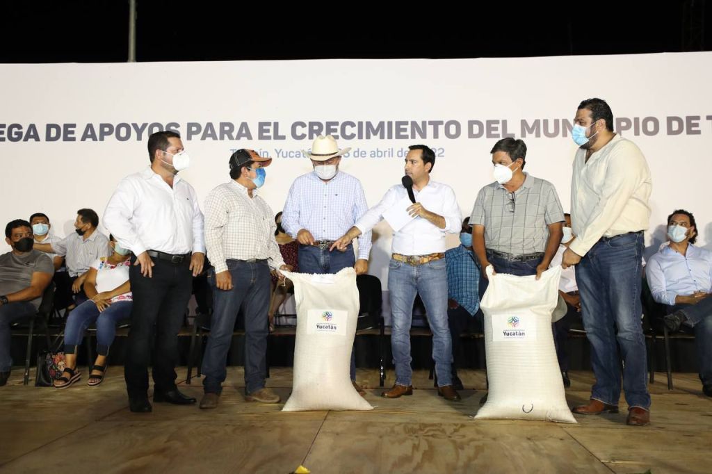 Tizimín, Yucatán, 25 de abril de 2022.- Hombres y mujeres de Tizimín, que dependen del campo, podrán impulsar su producción y la economía de sus familias, luego de que el Gobernador Mauricio Vila Dosal estuvo en este este municipio, entregando apoyos para respaldar y hacer crecer las actividades agrícola, apícola y ganadera.