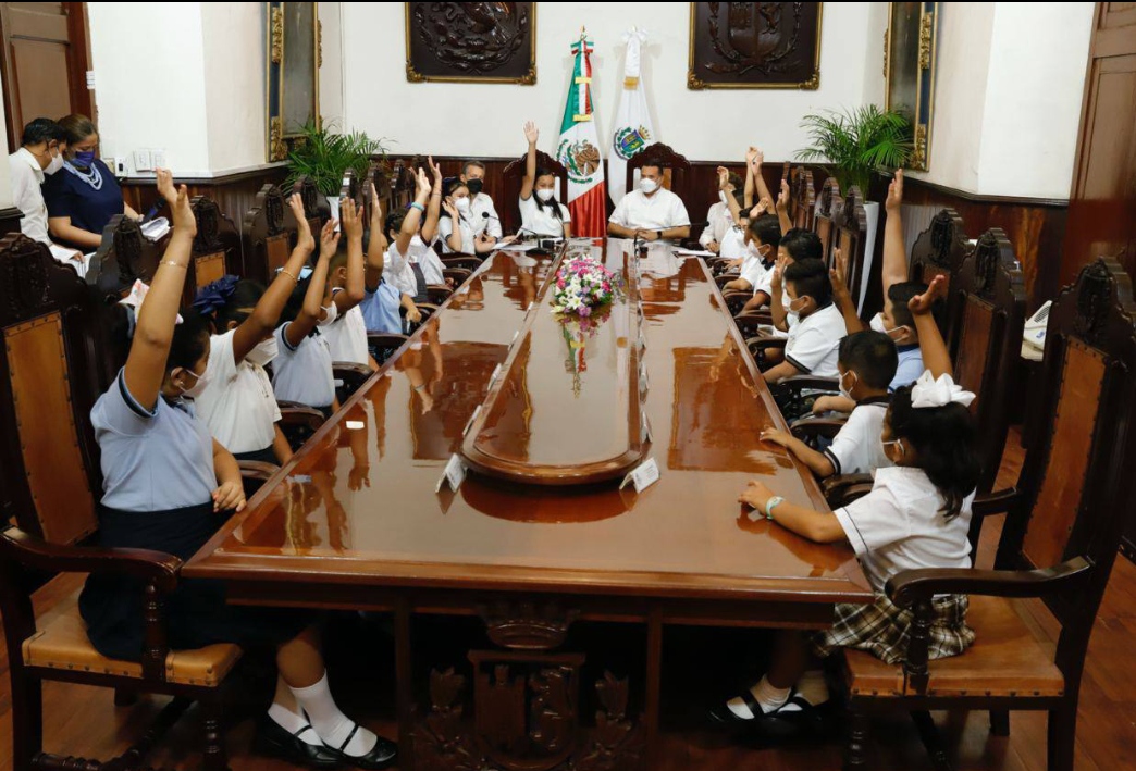 En la sesión de Cabildo efectuada en el marco de la celebración de la Semana de la niñez, 20 alumnas y alumnos destacados de escuelas primarias de la ciudad participaron por el día de hoy, como regidores de Mérida.