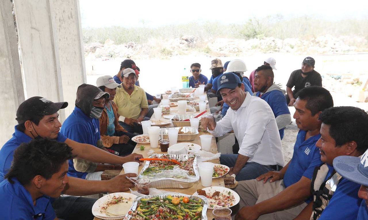 En una amena plática y convivencia con 28 alarifes que trabajan en la construcción de 56 casas tipo ensamble del complejo habitacional «Lajas Yucatán» ubicado al norte de Mérida, Vila Dosal compartió algunos de los proyectos que se están realizando para continuar con la transformación de Yucatán.