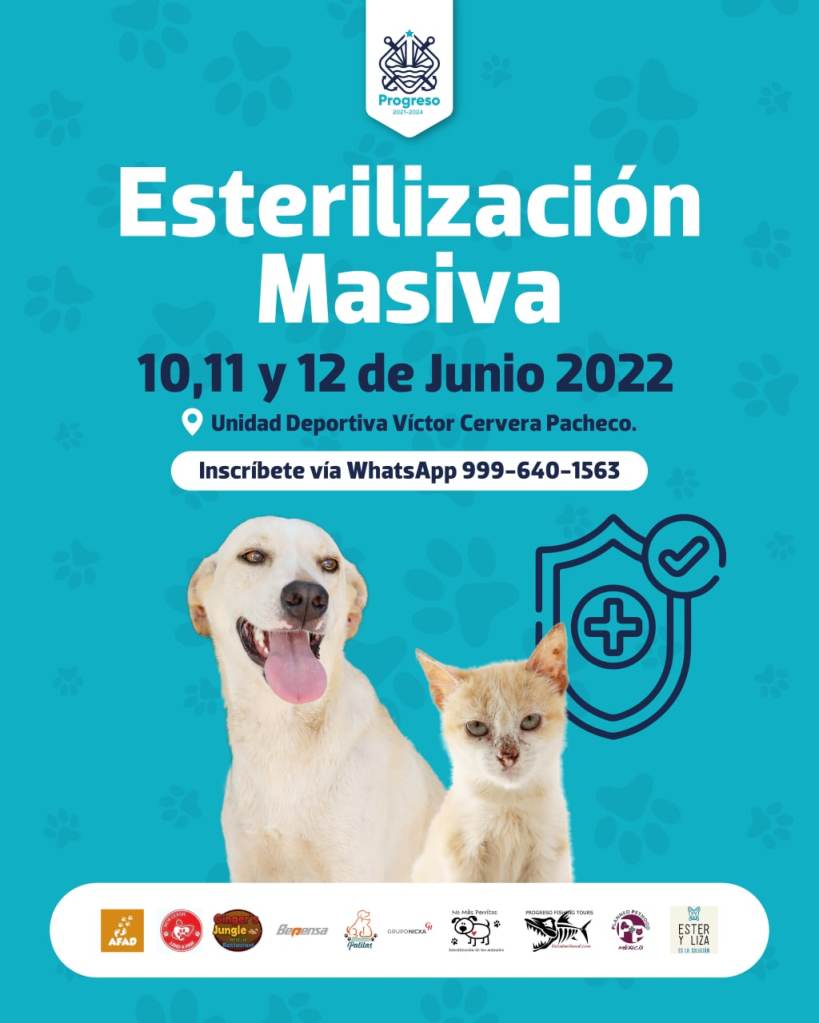 Progreso, 10 de mayo del 2022.- El H. Ayuntamiento de Progreso, a través de la Dirección de Desarrollo Sustentable y Unidad de Educación Ambiental, invitan a la población de puerto y sus comisarías, a las Jornadas de Esterilización Masiva Canina y Felina, que se llevará al cabo los días 10, 11 y 12 de junio.