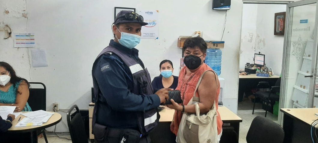 Minutos después se apersonó a la Policía Municipal de Mérida la propietaria de la cartera, a quien el oficial de policía Roberto Jesus López Arreguín procedió a hacerle entrega de la misma.