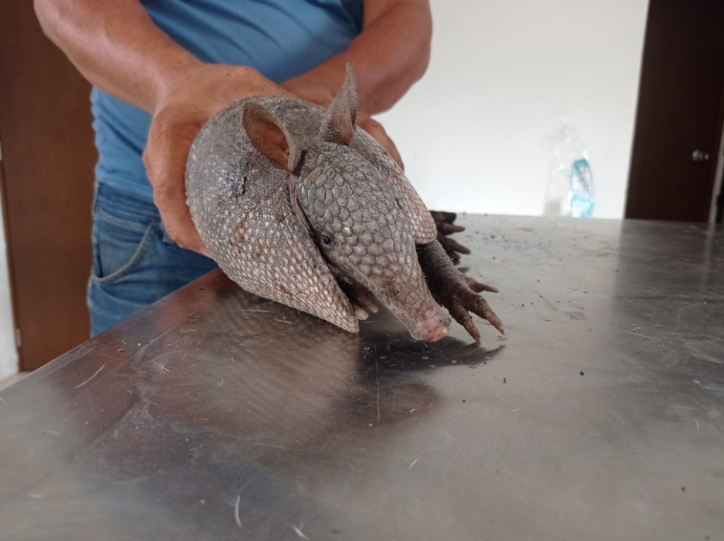 Protección Civil Umán rescata un armadillo mejor conocido como «huech» gracias al reporte que realizaron vecinos del fraccionamiento Paseos de Itzincab.