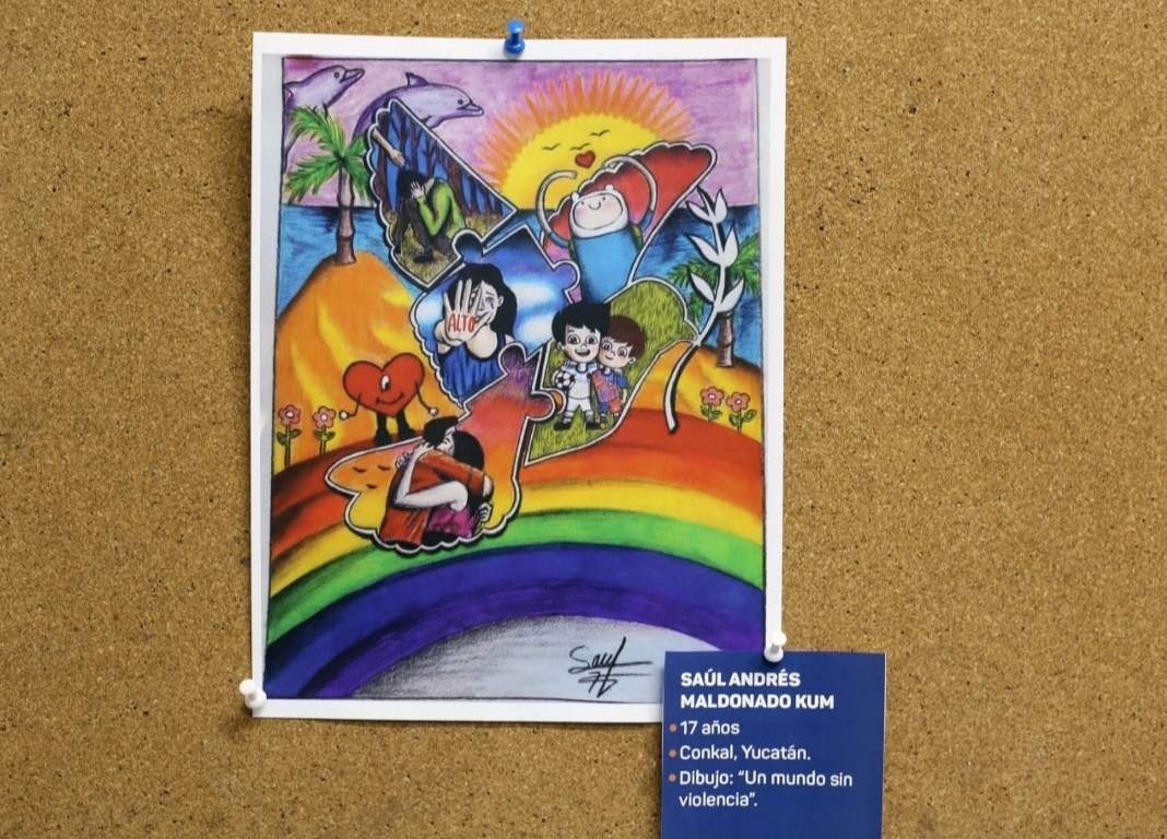 Mérida, Yucatán, 27 de mayo de 2022.- Saúl Andrés Maldonado Kum, de 17 años y originario de Conkal, con su obra “Un mundo sin violencia”, ganó el tercer Concurso Estatal de Dibujo “Derecho a vivir sin violencia”, que organizó el Sistema para el Desarrollo Integral de la familia (DIF) Yucatán, como parte de la campaña “Vive, respeta y protege. Juntas y juntos por los derechos de la niñez y adolescencia”.
