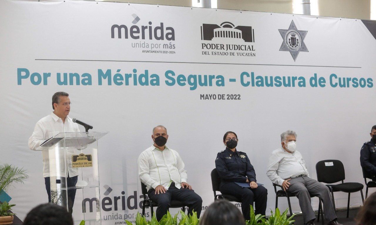 En su intervención, Luis Felipe Esperón Villanueva, magistrado de la Sala Colegiada Penal del Tribunal Superior de Justicia, explicó que como parte del Convenio Específico de Colaboración para el otorgamiento mutuo de capacitación se realizaron tres cursos de capacitación a personal de la Policía Municipal de Mérida, donde se han instruido a agentes de la Policía, jueces de paz, personal administrativo y mandos medios de la corporación.