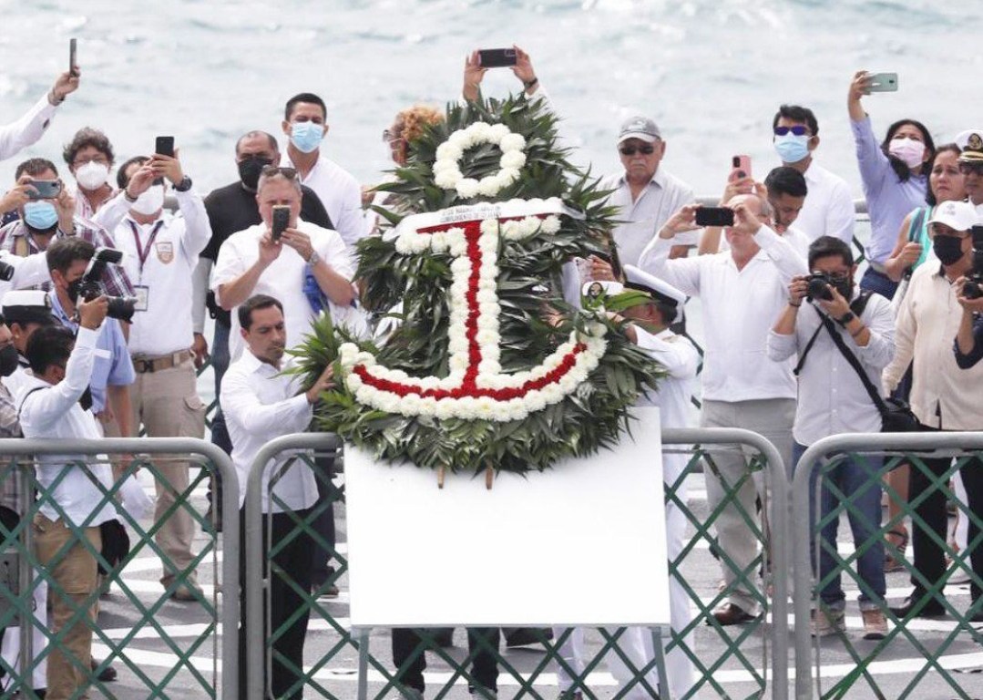 -A bordo del buque insignia “Veracruz”, Vila Dosal depositó una ofrenda floral en alta mar en honor a los marinos caídos en el cumplimiento de su deber y entregó reconocimientos a personas destacadas del sector marítimo y portuario.
