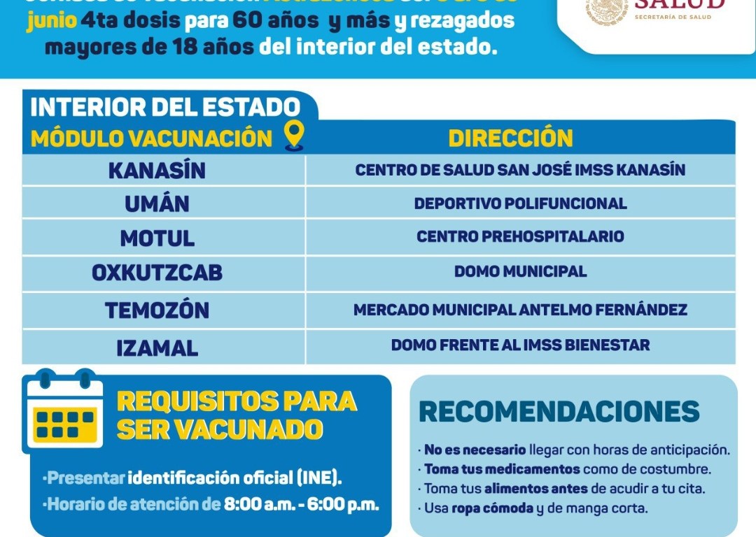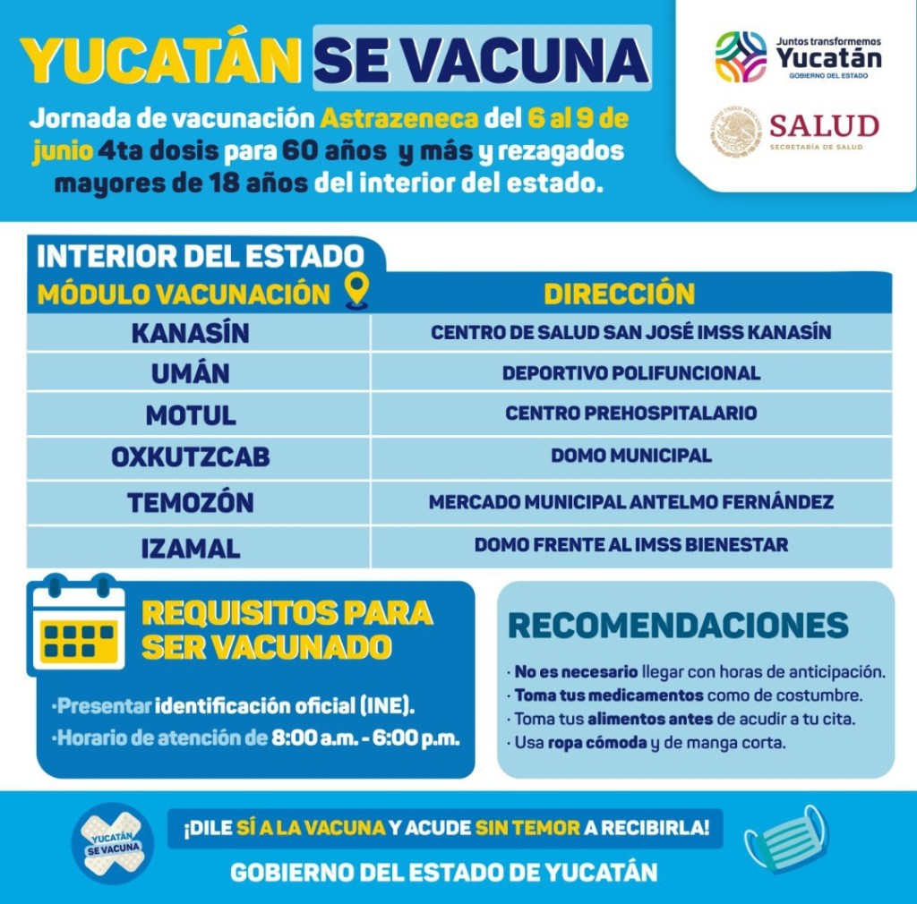 Mérida, Yucatán, 1 de junio de 2022.-Del lunes 6 al jueves 9 de junio, se llevará a cabo una nueva jornada de vacunación contra el Coronavirus para la aplicación de la cuarta dosis para adultos mayores de 60 años en los municipios de Kanasín, Umán, Motul, Oxkutzcab, Temozón e Izamal, informó la Secretaría de Salud de Yucatán (SSY).