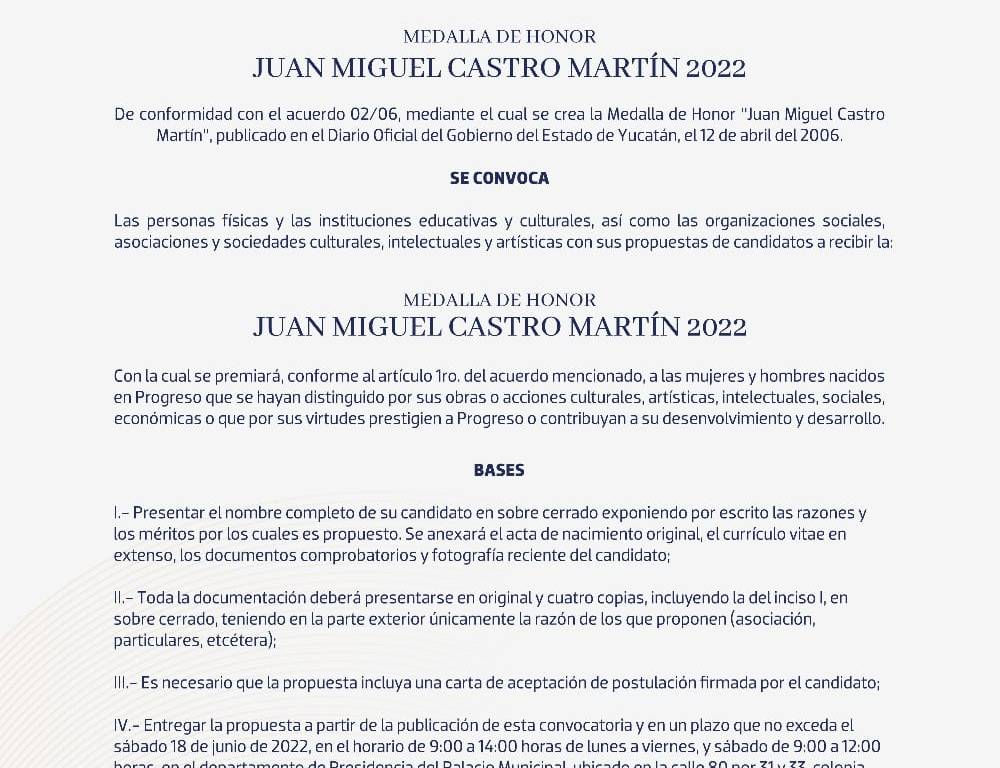 Como es tradición, la medalla de honor “Juan Miguel Castro Martín” será entregada en el marco de los festejos del 151 Aniversario de la fundación del municipio, y quien sea electo para ser acreedor o acreedora a esta medalla, deberá ser una persona que se hayan distinguido por sus obras o acciones, ya sean culturales, artísticas, intelectuales, sociales, económicas o que por sus virtudes prestigien a Progreso o contribuyan a su desenvolvimiento y desarrollo.