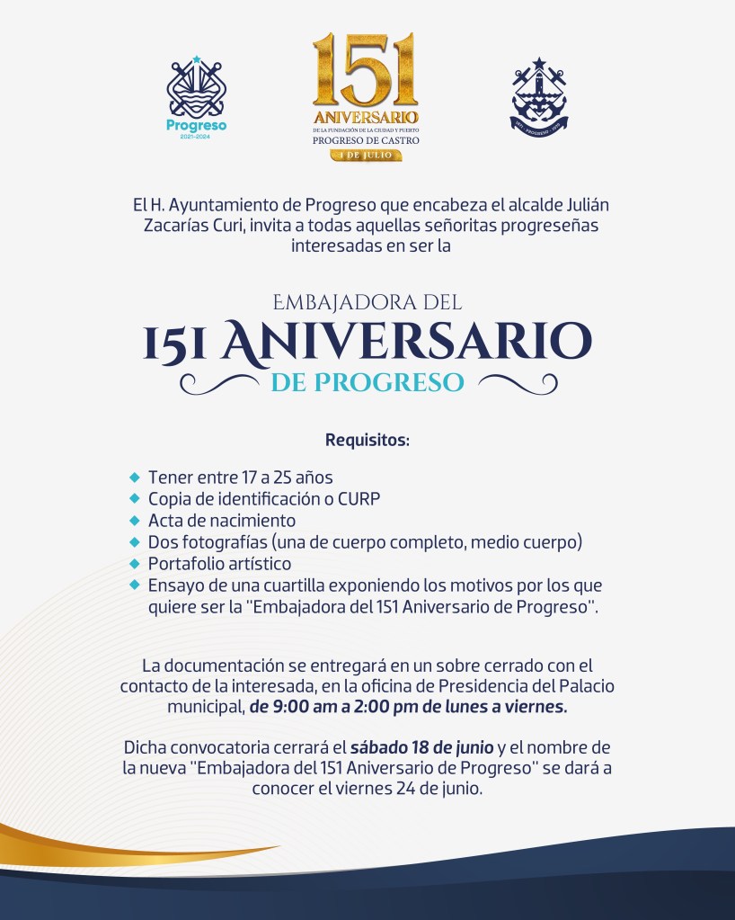 PROGRESO, 2 de junio del 2022. – El H. Ayuntamiento que preside el Alcalde Julián Zacarías Curi, dio a conocer la convocatoria para elegir a la Embajadora de los Festejos del 151 Aniversario de la Fundación de la ciudad y puerto de Progreso de Castro.