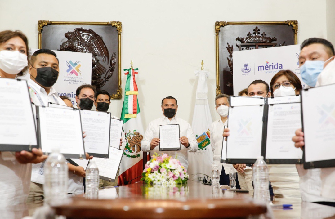 Mérida, Yucatán a 15 de junio de 2022.- Con el objetivo de brindar mayor certeza jurídica, infraestructura, servicios públicos y procurar el desarrollo urbano ordenado y equitativo con los 12 municipios que componen la zona metropolitana, los presidentes municipales en coordinación con el Gobierno del Estado firmamos un convenio para mejorar la calidad de vida de la población que está en los 832 kilómetros que forman el perímetro de Mérida, informó el Alcalde, Renán Barrera Concha.