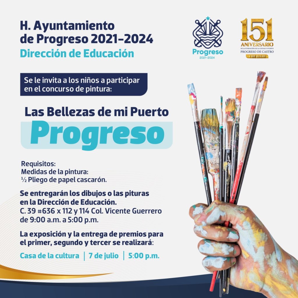 PROGRESO, 20 de junio del 2022.- En el marco del 151 Aniversario de la fundación de Progreso de Castro, el H. Ayuntamiento que preside el alcalde Julián Zacarias Curi, invita a todos los niños del municipio y sus comisarías, a participar en el concurso de pintura “Las Bellezas de mi Puerto”.