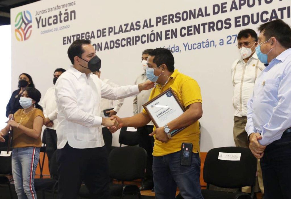 Mérida, Yucatán, 27 de junio de 2022.- En un acto de justicia laboral, como reconocimiento al esfuerzo y la dedicación del personal de apoyo o asistencia a la educación, que por hasta 12 años, ha brindado sus servicios en planteles de nivel básico bajo contrato, el Gobernador Mauricio Vila Dosal entregó 399 plazas, con lo que se les brinda mayor certeza, estabilidad y mejores condiciones, a ellos y sus familias.