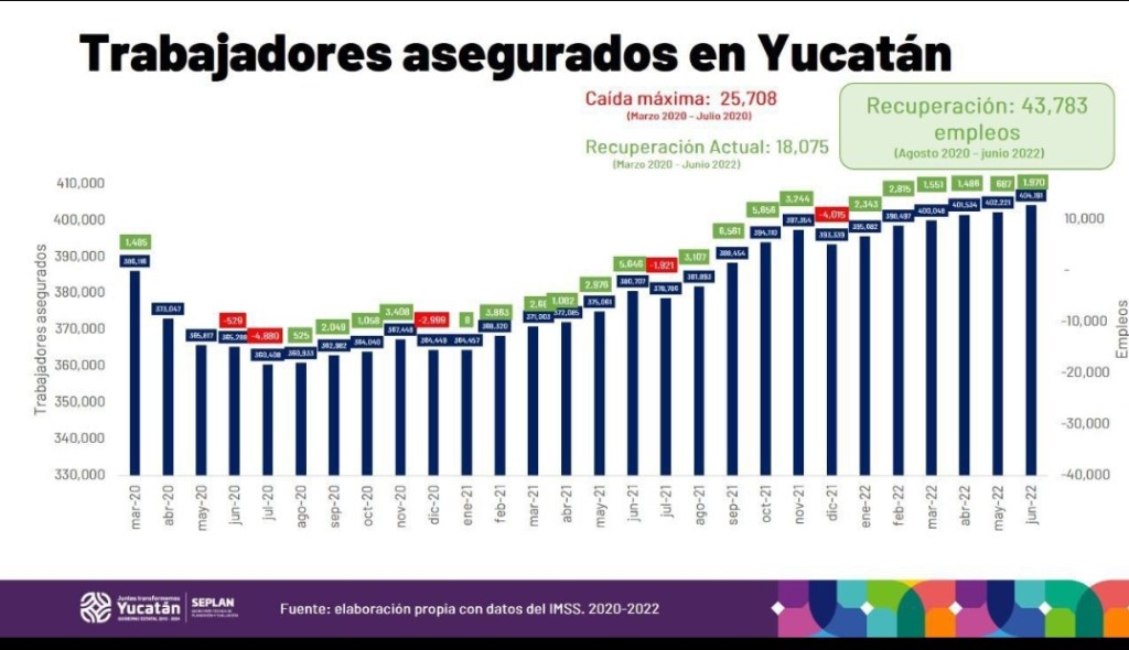 Hay que recordar que, por efecto de la pandemia, en tan solo cuatro meses se perdieron 25 mil 708 plazas laborales, sin embargo, fruto de la promoción realizada por el Gobernador Vila Dosal para atraer inversiones a Yucatán, así como la enérgica estrategia de reactivación económica, se han creado 42,000 nuevas plazas, superando por más de 16,000 la cifra de pérdidas.