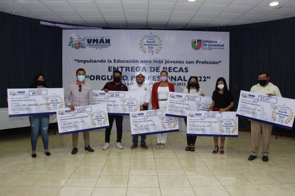 Uman, Yucatán a 16 de julio de 2022.- Un total de 41 jóvenes de la Ciudad Capital de las Industrias recibieron becas del programa «Orgullo Profesional 2022» que otorga el Ayuntamiento de Umán a estudiantes que están por terminar sus estudios universitarios para que puedan titularse.