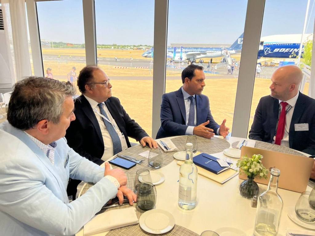 Farnborough, Reino Unido, 19 de julio de 2022.- En el segundo día de actividades la Feria Aeronáutica Internacional de Farnborough, en Reino Unido, el Gobernador Mauricio Vila Dosal sostuvo encuentros con directivos de la empresa Safran, empresa especializada en defensa, equipamiento aeronáutico y de seguridad, para presentar a Yucatán como una opción certera de inversión por sus múltiples ventajas, como la seguridad, calidad de vida y la preparación de los profesionistas en este sector, lo que contribuye a generar más y mejores empleos para los yucatecos.