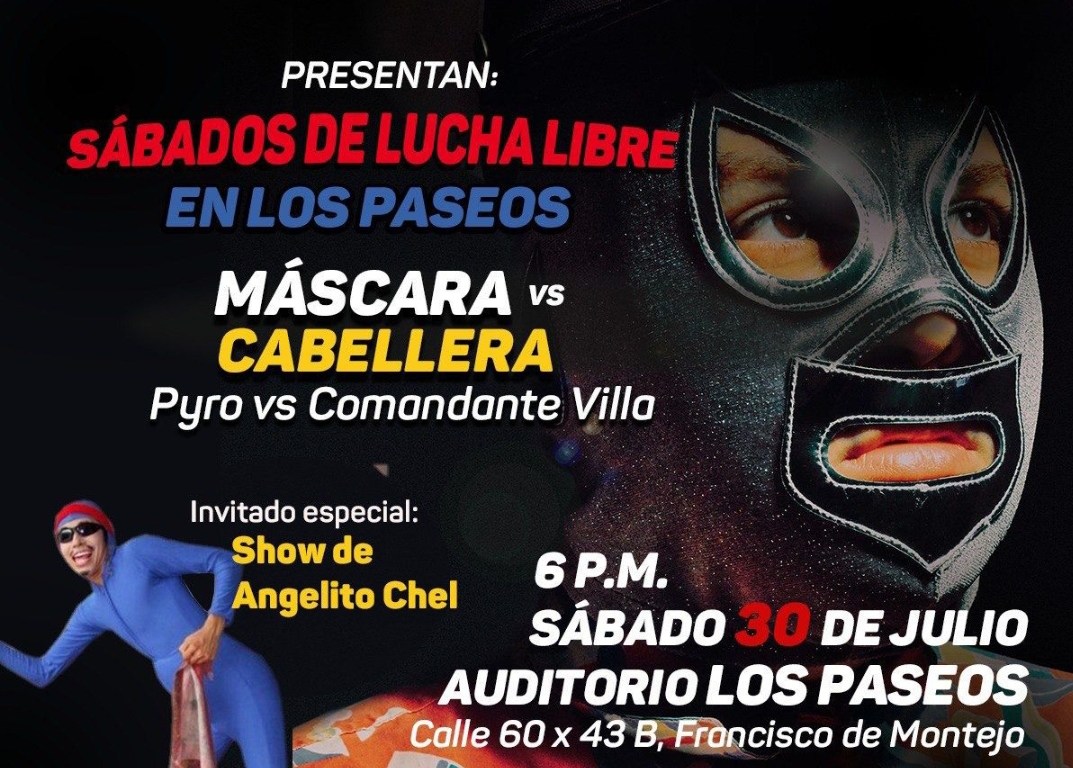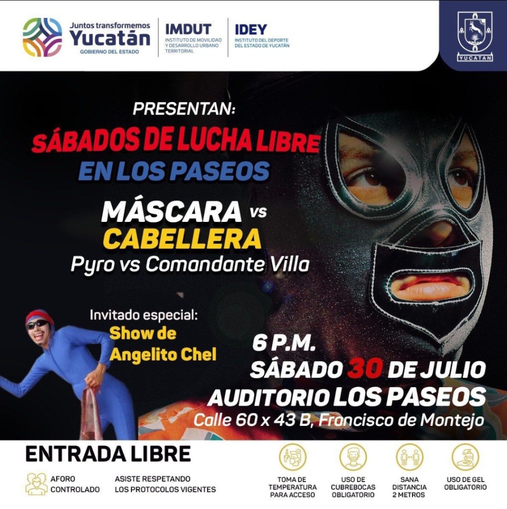 Mérida, Yucatán, 28 de julio de 2022.- Este sábado 30 de julio, a las 18:00 horas, habrá una función gratuita de lucha libre de Los Paseos, con una pelea de máscara contra cabellera, que presentan los Institutos de Movilidad y Desarrollo Urbano Territorial (Imdut) y del Deporte (IDEY), para fomentar la actividad física y la sana convivencia, como ha instruido el Gobernador Mauricio Vila Dosal.