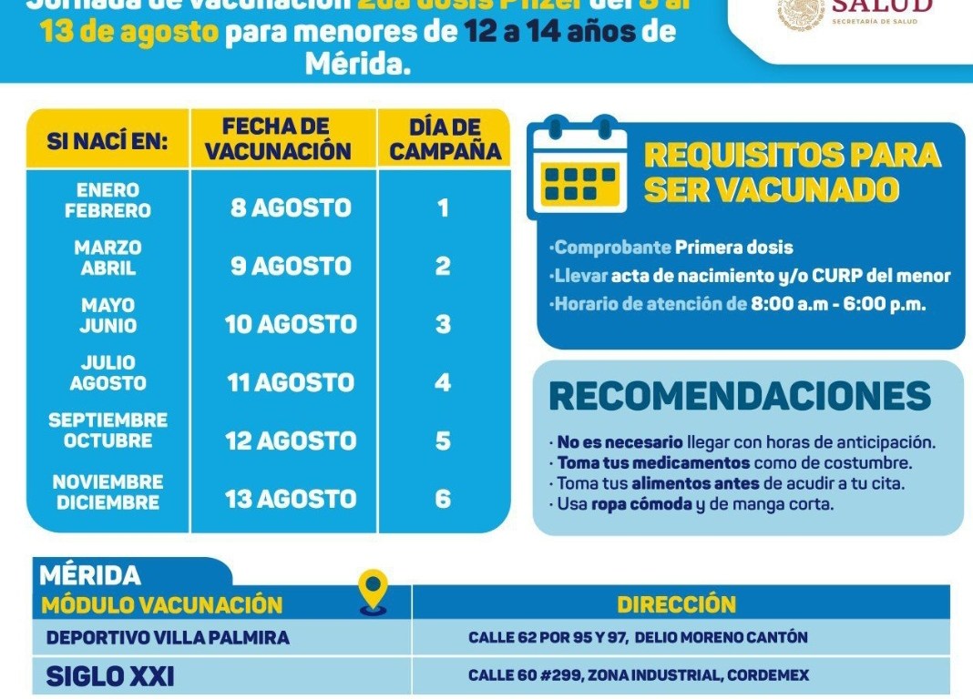 -Las Secretarías de Salud de Yucatán (SSY) y del Bienestar informaron que, para ambos grupos de edad, las dosis se aplicarán en los macrocentros de vacunación de la Unidad Deportiva Villa Palmira y en el Centro de Convenciones Yucatán Siglo XXI.