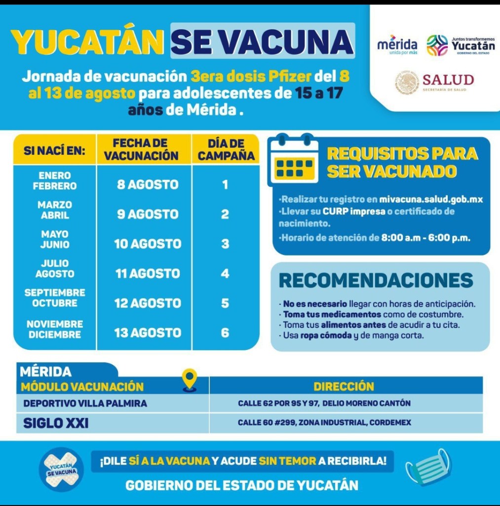 Mérida, Yucatán, 2 de agosto de 2022.- A partir del próximo lunes 8 al sábado 13 de agosto se llevará a cabo una nueva fase de la vacunación contra el Coronavirus en Yucatán, por lo que se aplicarán las segundas dosis para adolescentes de 12 a 14 y tercera dosis para jóvenes de 15 a 17 años de Mérida, informaron las Secretarías de Salud del estado (SSY) y del Bienestar.