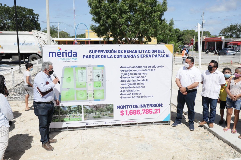 Acompañado de Alan Jonathan Herrera Pool, comisario de Sierra Papacal, los directores David Loría Magdub, (Obras Públicas) y María José Cáceres Delgado, (Desarrollo Social), el Presidente Municipal supervisó la rehabilitación del parque el cual tendrá una inversión de 1 millón 686 mil 785 pesos, provenientes de recursos de infraestructura para beneficio de 1,556 personas.