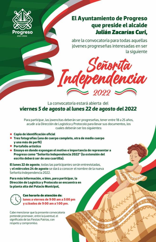 PROGRESO, 05 de agosto del 2022. – El H. Ayuntamiento que preside el alcalde Julián Zacarías Curi, dio a conocer la convocatoria para elegir a la Señorita Independencia 2022, misma que representará al municipio en las próximas festividades correspondientes al mes patrio.