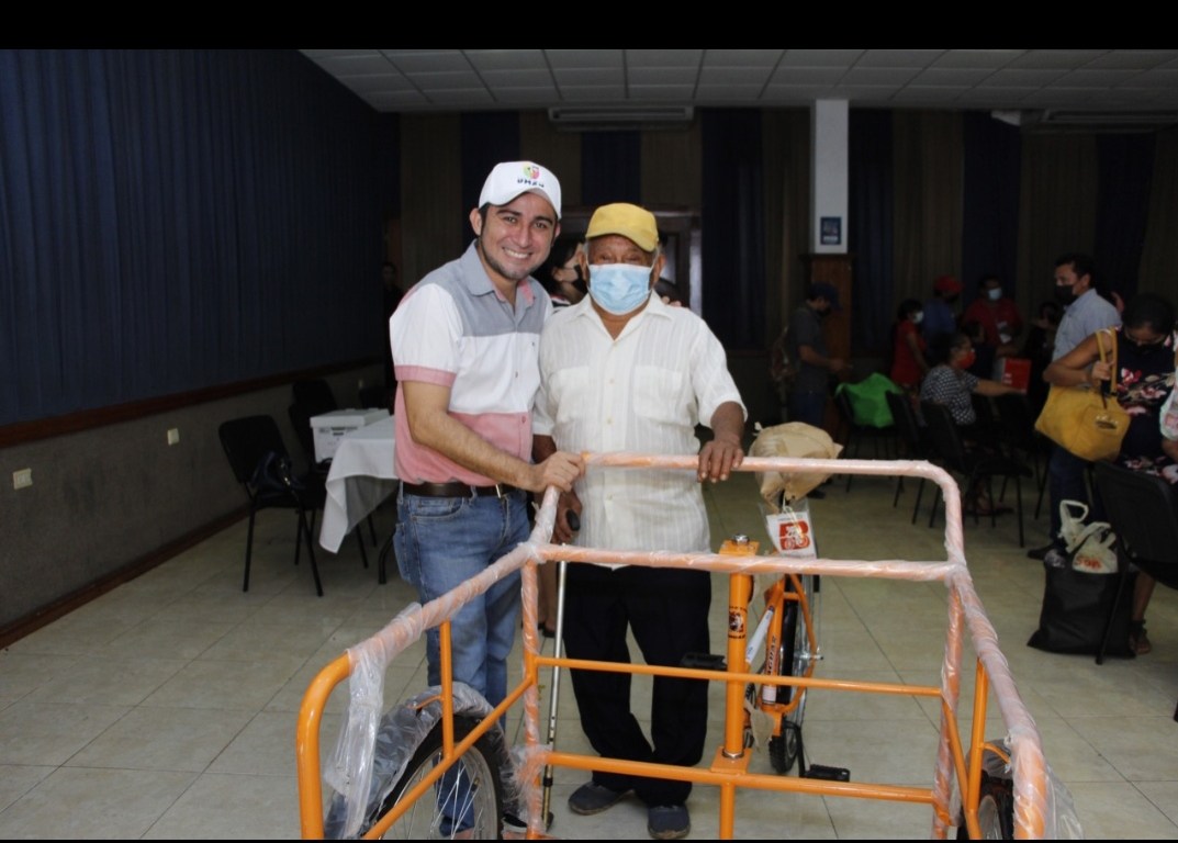 En ceremonia de entrega de los productos a los 35 beneficiarios que consistieron en ocho triciclos, 15 kits de bastidor e hilos de hamaca para igual número de personas de la comisaría de Poxilá, dos máquinas de coser, 10 kits de hilo para urdido, que fueron dirigidos para habitantes de diversas colonias, fraccionamientos e incluso otras comisarías de Umán.