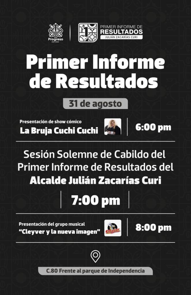 El alcalde de Progreso, Julián Zacarías Curi rendirá su primer informe de resultados este 31 de agosto a las 7 de la noche en los bajos de Palacio Municipal