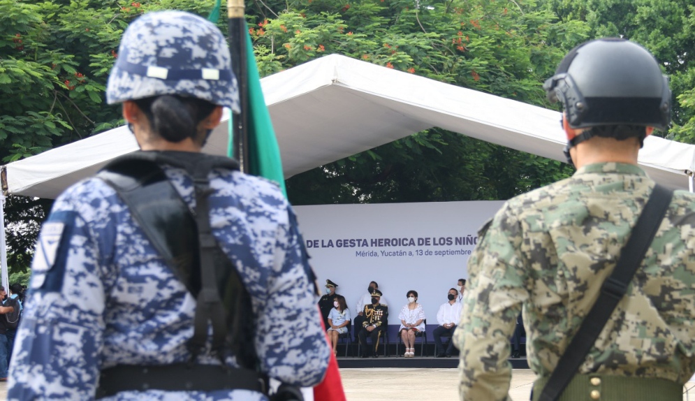 En representación del Gobernador Mauricio Vila Dosal, y ante la presencia de oficiales y tropas del Ejército Mexicano, Armada de México y Guardia Nacional, así como estudiantes y maestros de la Escuela Primaria “Distrito Federal”, la funcionaria refrendó honores a los alumnos del Colegio Militar que en 1847 combatieron al ejército invasor estadounidense.