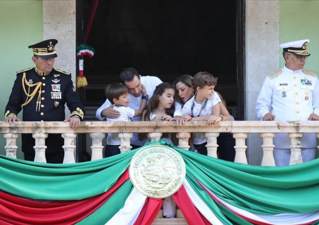 Acompañado de su esposa, María Eugenia Ortiz Abraham, y sus 3 hijos Mauricio, Santiago y Alejandrina, el Gobernador presenció desde el balcón central de Palacio de Gobierno el desfile en el que participaron contingentes conformados por 4,595 elementos para conmemorar los festejos patrios por el aniversario 212 del inicio de la independencia de México.