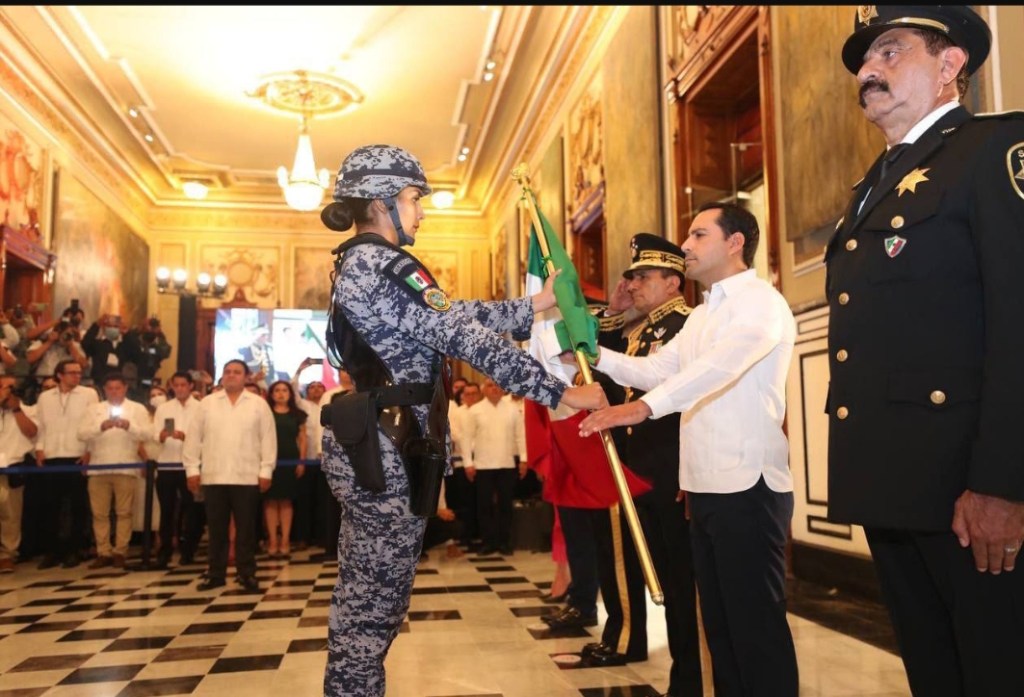 Minutos antes, Vila Dosal encabezó los honores de ordenanza y recibió el lábaro patrio de manos de la Teniente Fuerza Aérea Controlador de Vuelo, Cielo Nadxiely García Arteaga, comandante de la primera escolta mixta de elementos de las Fuerzas Armadas que, por primera vez, fue la encargada de entregar la bandera nacional al Gobernador.