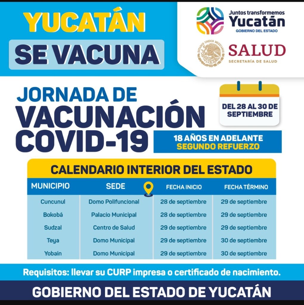 Las dosis de refuerzo para personas de 18 años en adelante, que no cuenten con su esquema de vacunación completo, se aplicarán del 28 al 29 de este mes, en Cuncunul y Bokobá; 29 y 30, para Teya y Yobaín, y únicamente el 29, en Sudzal.
