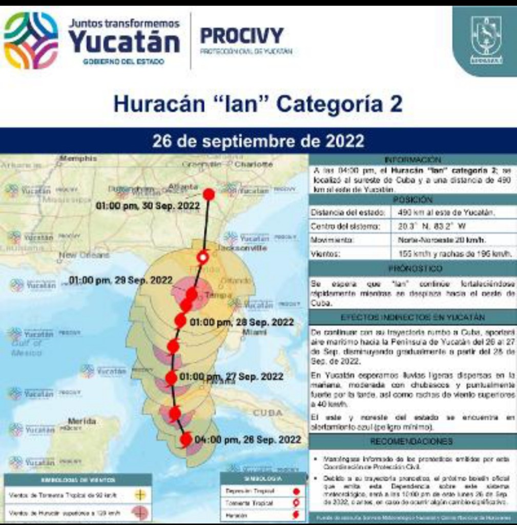 Convertido ya en huracán categoría 2, “Ian” mantiene su trayectoria noroeste con velocidad de desplazamiento de 20 km/h, por lo que en el transcurso de las próximas horas afectaría la punta oeste de Cuba con efectos de nubosidad y humedad hacia la península de Yucatán.