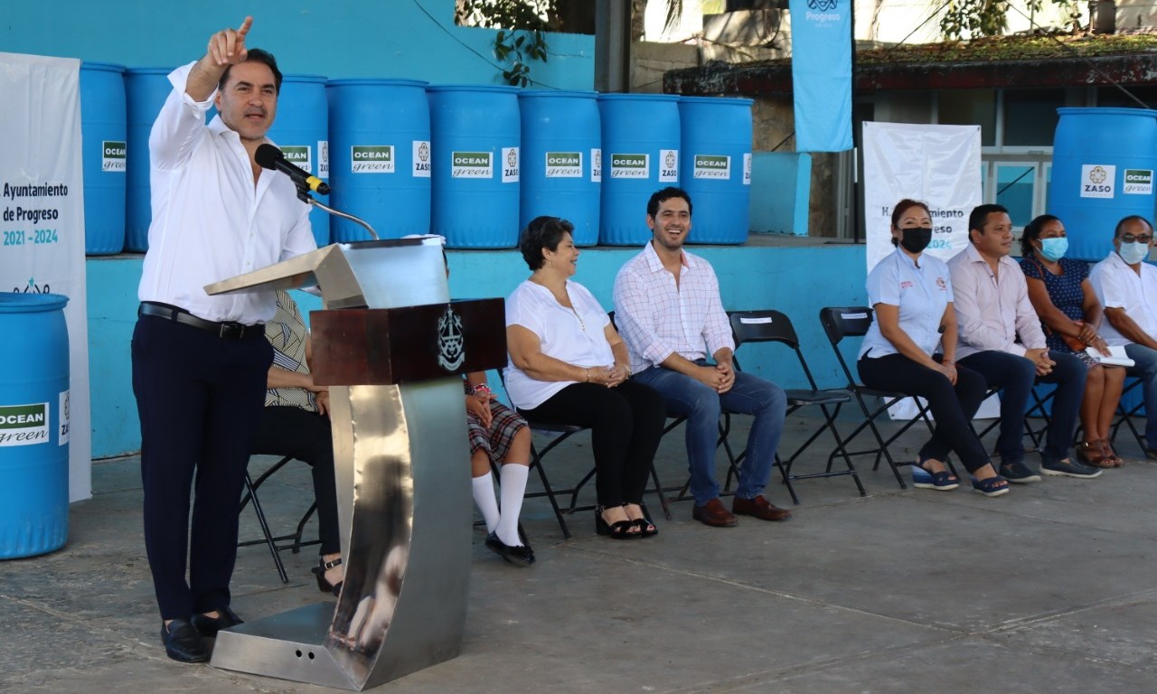 PROGRESO, 29 de septiembre. – El alcalde Julián Zacarías Curi realizó la entrega simbólica de la donación de 50 contenedores de basura de plástico de alta densidad donados por las empresas “ZASO Company” y “Ocean Green”, los cuales fueron entregados a escuelas de nivel preescolar y primaria del municipio y sus comisarias.